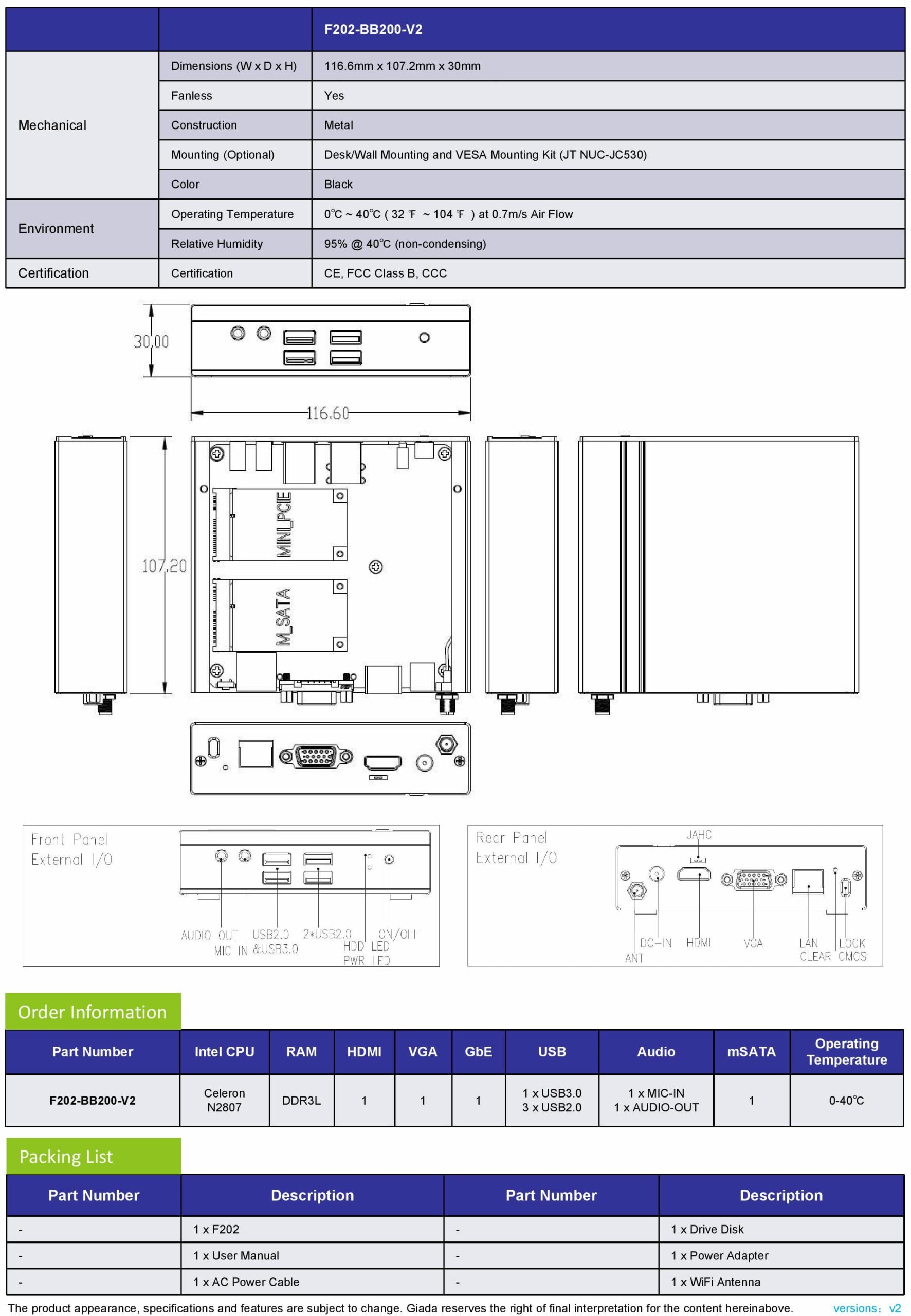 Giada F202 Fanless Celeron N2807 2GB 1xVGA|1xHDMI